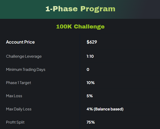 For One-step challenge accounts, traders undergo a single-phase evaluation, aiming to reach a profit target of 10% before becoming funded. With maximum daily loss and maximum loss rules set at 4% and 5% respectively, these accounts offer a realistic trading opportunity. Traders can earn 75% profit splits and have the potential to scale their accounts.