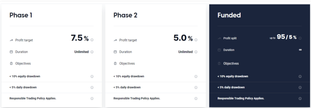Profit target represents a specific percentage of profit that traders need to achieve before they can complete an evaluation phase, withdraw profits, or scale their account. For phase 1, the profit target is set at 7.5%, while phase 2 has a profit target of 5%. However, funded accounts do not have profit targets.